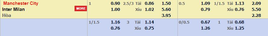 - Mức kèo nhà cái cược chấp trận này: Manchester City chấp 1 Trái. Manchester City ăn 0,90. Inter Milan ăn 1,00