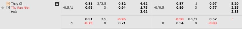 - Mức kèo nhà cái cược chấp trận này: Tây Ban Nha chấp 0,75 Trái. Thụy Sĩ ăn 0,81. Tây Ban Nha ăn 0,95